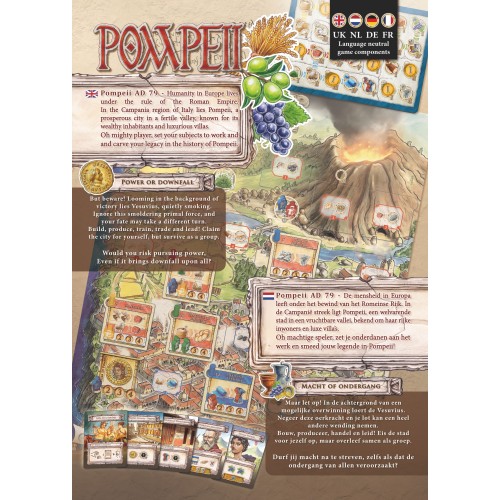 In Pompeii ontwikkelen spelers samen de stad door slim te plannen, middelen te beheren en te onderhandelen. Samenwerking houdt de vulkaan in toom, maar slechts één leider zal blijvende roem oogsten. Het spel verloopt in twee fasen: De Rust, waarin spelers hun stad uitbreiden en hun strategie verfijnen, en Het Ontwaken, wanneer de Vesuvius begint te rommelen en gezamenlijke offers nodig zijn om een ramp te voorkomen.